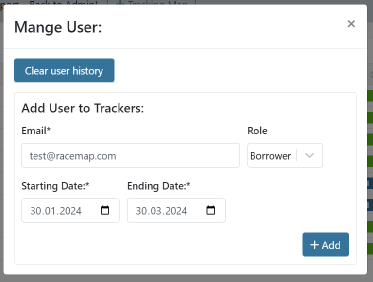 * Select "Manage User" to select a Racemap user and allow access to your devices.&#x20;